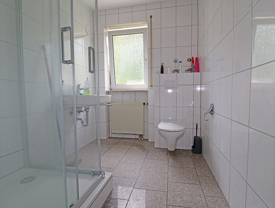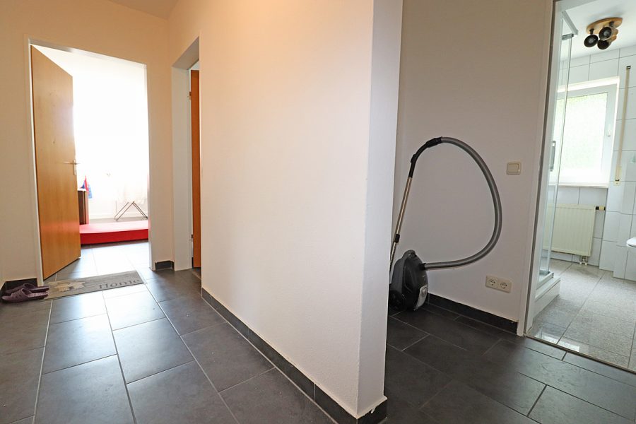 Vom größten Büroraum gelangt man durch eine Tür zu einem weiteren Flur. Hier gelangt man zum Duschbad mit Fenster.