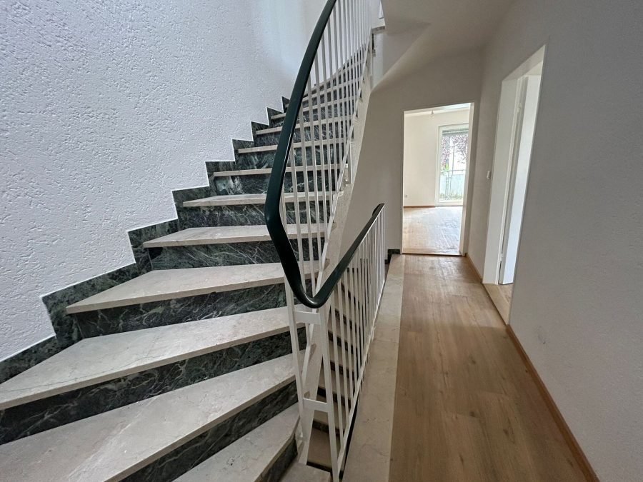 Über eine massive Treppe gelangen Sie ins 1. OG. Hier befindet sich das große Elternschlafzimmer und das Bad mit Badewanne und Fenster.