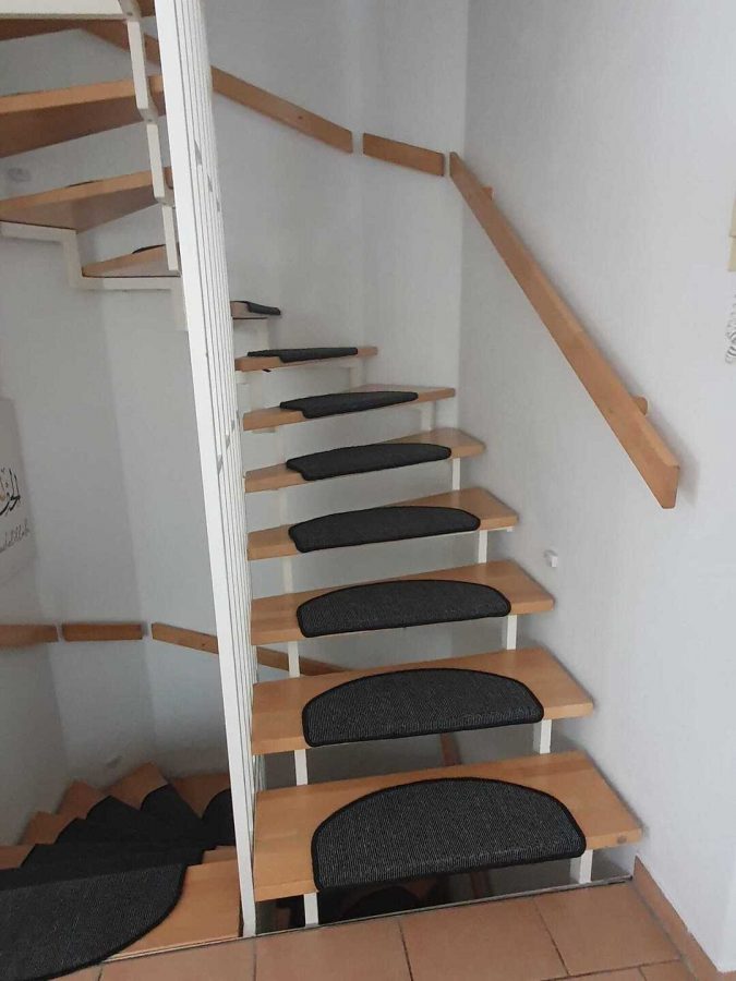 Über eine Treppe aus Massivholz gelangen Sie ins 1. OG. Hier befindet sich das große Elternschlafzimmer und das Bad mit Badewanne und Fenster.