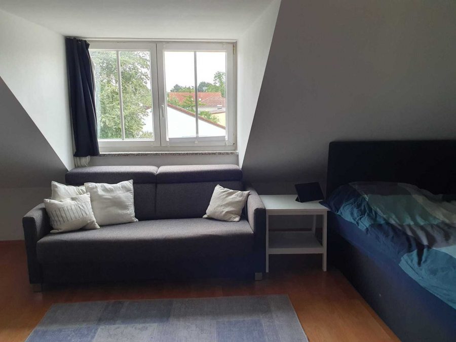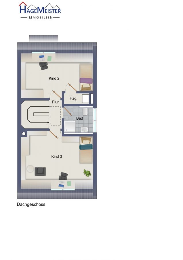 Über die Treppe erreichen Sie weiter das Dachgeschoss. Trotz Schrägen hat hier Ihr Kind ein großes Kinderzimmer zum Spielen und Schlafen.