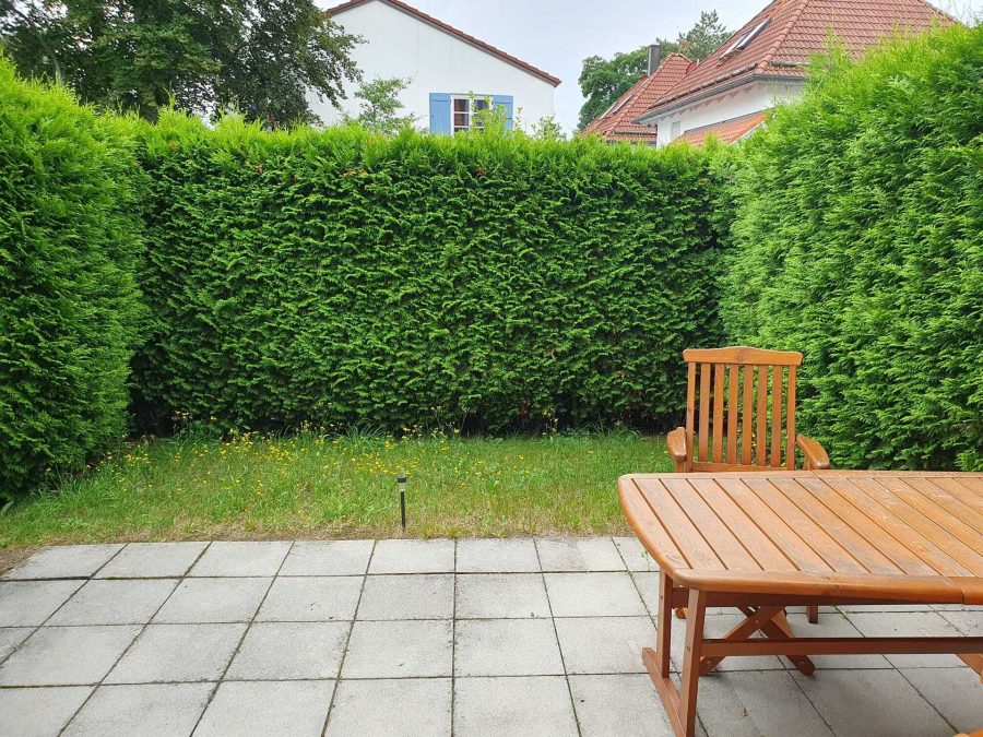 Vom Wohnzimmer aus haben Sie Zugang zur traumhaften Süd-Terrasse mit Garten. Die Hecken bieten Ihnen komfortablen Sichtschutz. Die Terrasse lädt zum Verweilen ein.