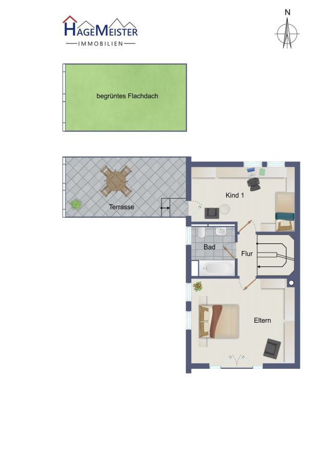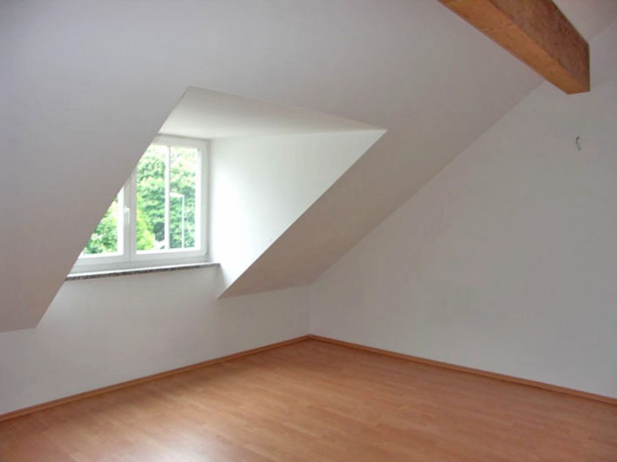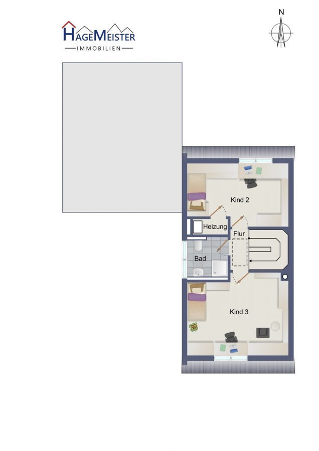 Über die Wendeltreppe gelangen Sie zum Dachgeschoss. Trotz Schrägen hat hier Ihr Kind ein großes Kinderzimmer zum Spielen und Schlafen. Oben im Dachspitz ist Platz für ein praktisches Kinderhochbett.