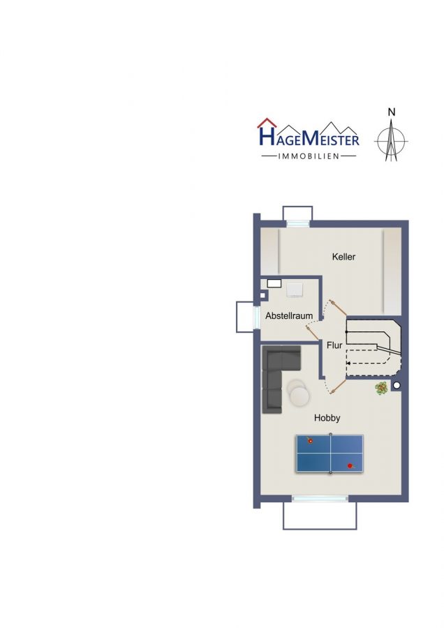 Weitere Annehmlichkeiten sind der großer wohnraummäßig ausgebauter Hobbyraum, ein Kellerraum und ein Abstellraum.