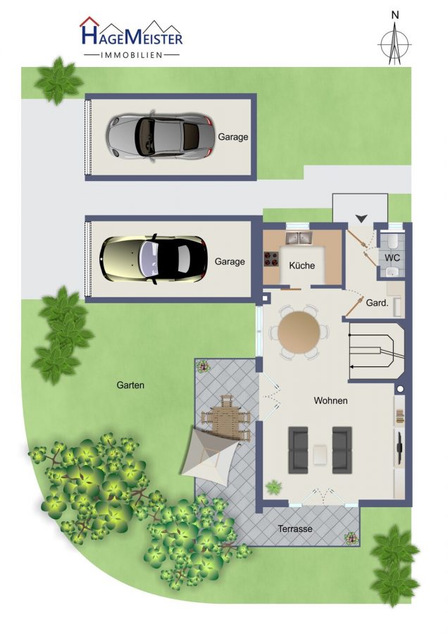Vom Wohnzimmer aus haben Sie Zugang zur traumhaften Süd-West-Terrasse mit Garten. Die Hecken bieten Ihnen komfortablen Sichtschutz. Die Terrasse lädt zum Verweilen ein.