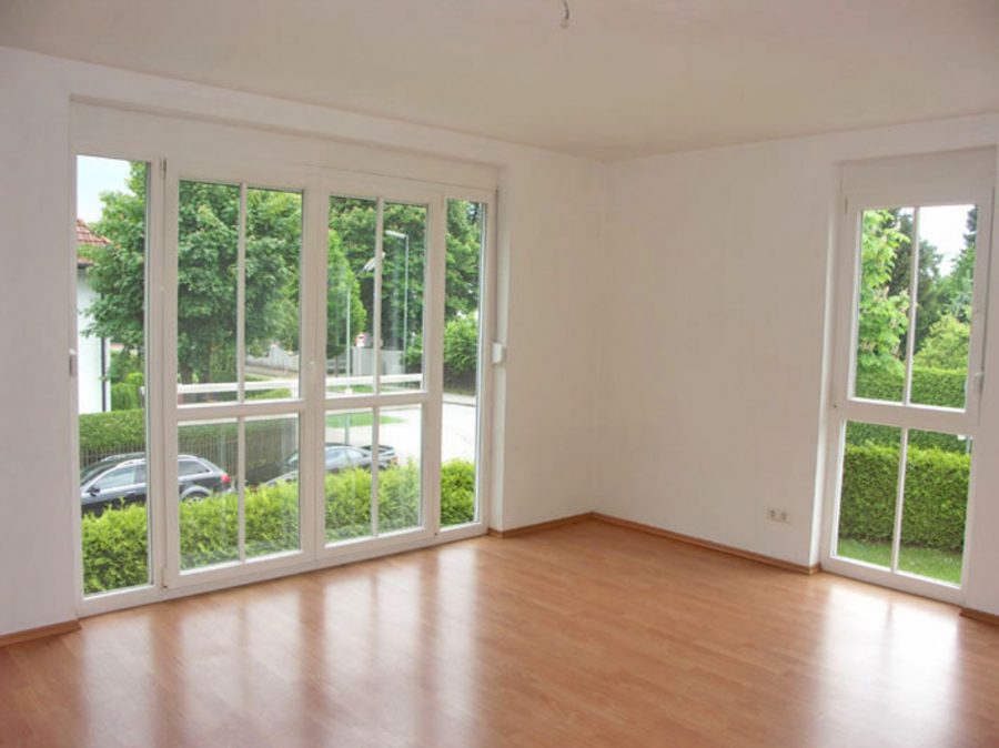 Durch die Süd-West-Ausrichtung und die großen Fensterfronten gelangt viel Sonne ins Wohnzimmer. Hier ist genug Platz, um einen großen Esstisch sowie eine gemütliche Couchlandschaft zu integrieren.