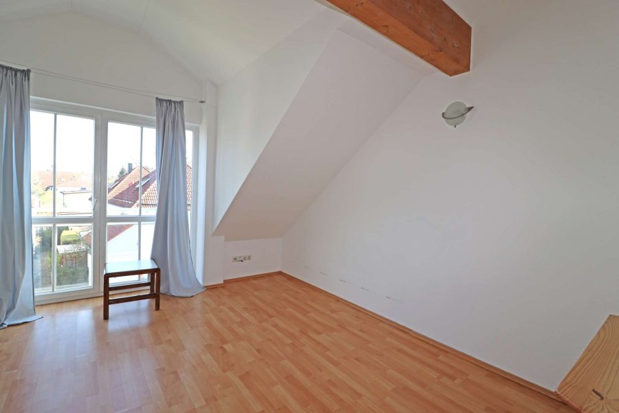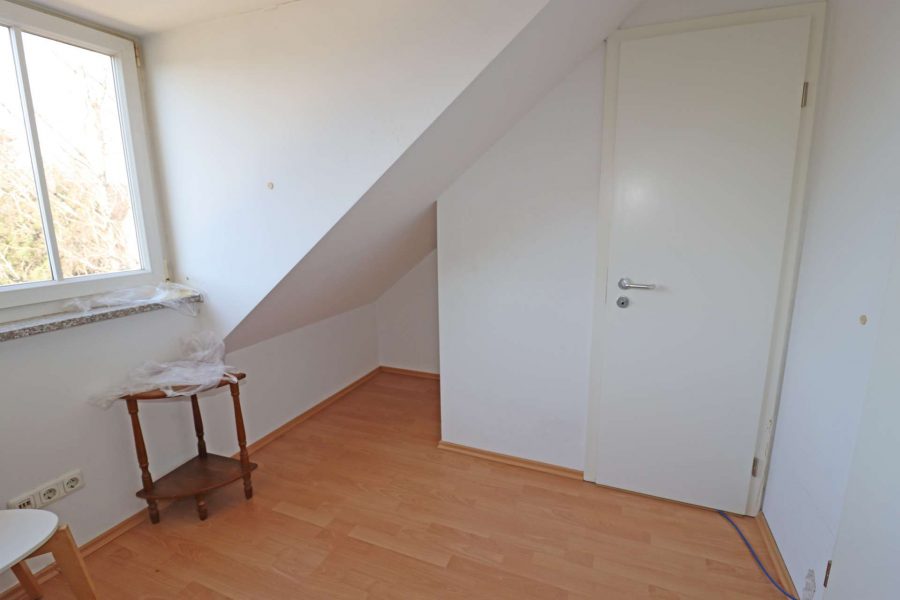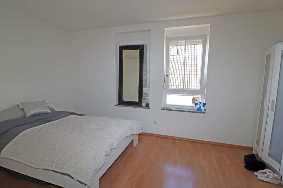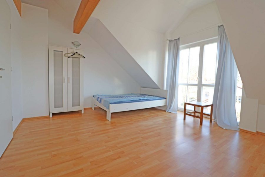 Über eine Wendeltreppe aus Massivholz gelangen Sie ins 1. OG. Hier befindet sich das große Elternschlafzimmer und das Bad mit Badewanne und Fenster.