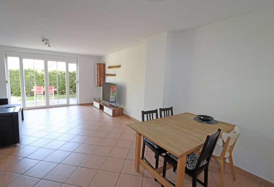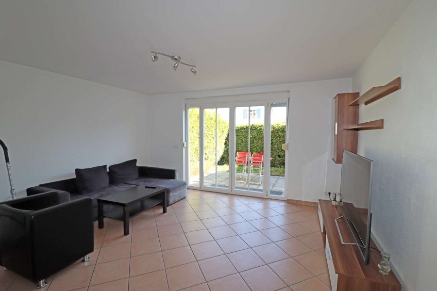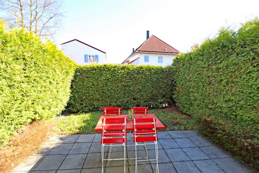 Vom Wohnzimmer aus haben Sie Zugang zur traumhaften Süd-Terrasse mit Garten. Die Hecken bieten Ihnen komfortablen Sichtschutz. Die Terrasse lädt zum Verweilen ein.