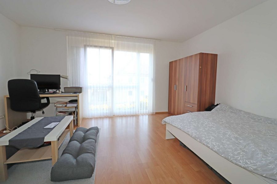 Durch die Süd-Ausrichtung und die großen Fensterfronten gelangt viel Sonne ins Wohnzimmer. Hier ist genug Platz, um einen großen Esstisch sowie eine gemütliche Couchlandschaft zu integrieren.