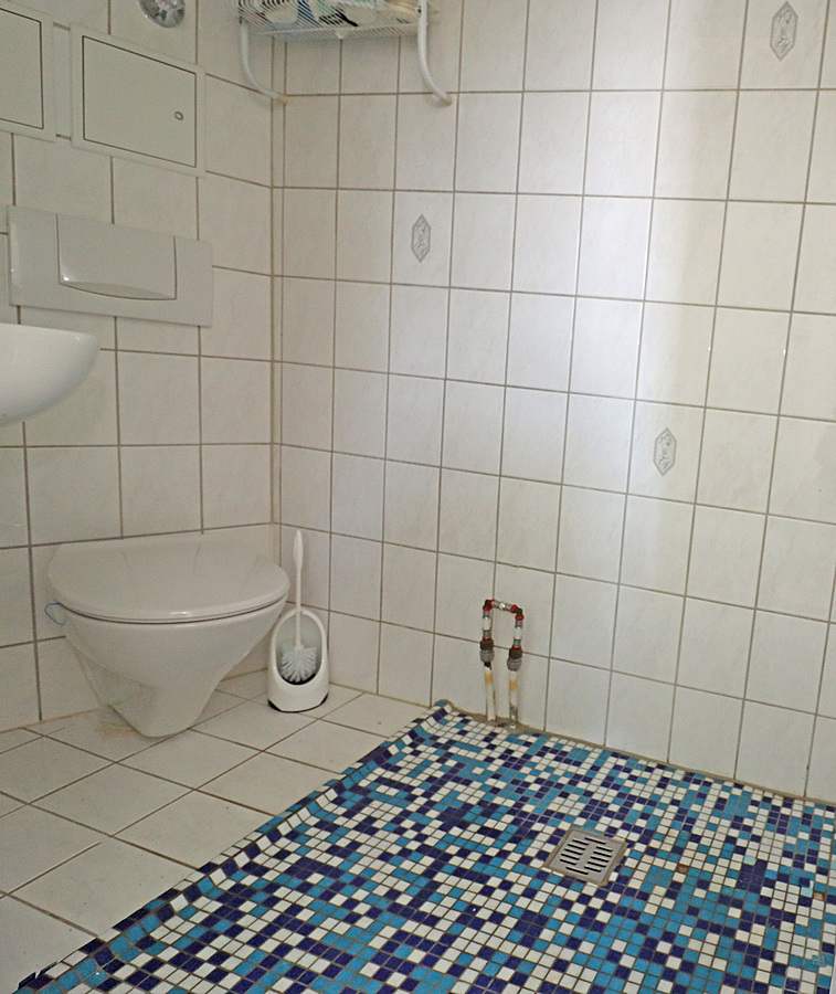 Zur Linken befindet sich ein Gäste-WC mit Bodendusche.