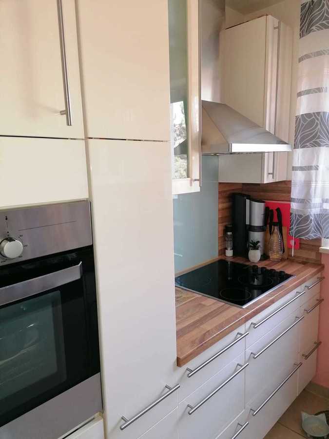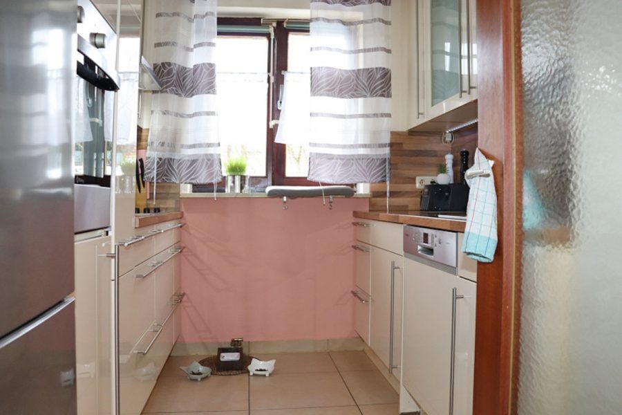 Daneben befindet sich die gut und mit hochwertigen Markengeräten ausgestattete, weiße Einbauküche. Auch die Waschmaschine ist in der Küche integriert.