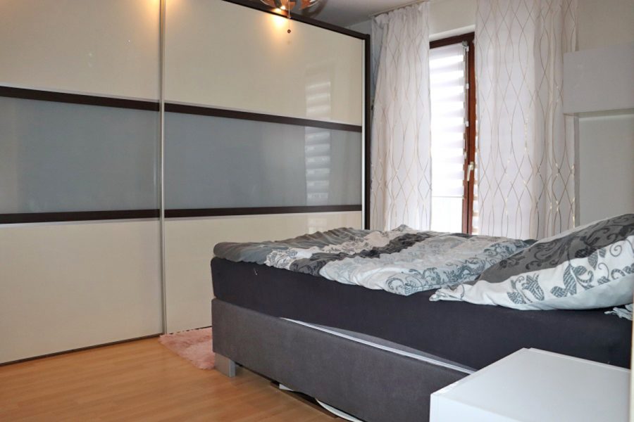 Das Schlafzimmer befindet sich zwischen Küche und Wohnzimmer. Hier hat ein XXL-Schrank, sowie beispielsweise ein modernes Boxspring-Bett Platz.