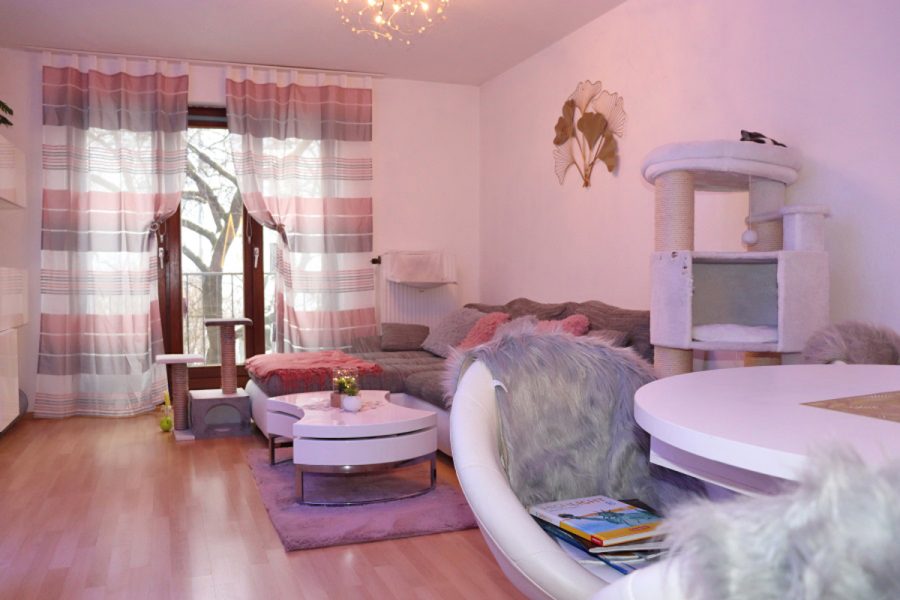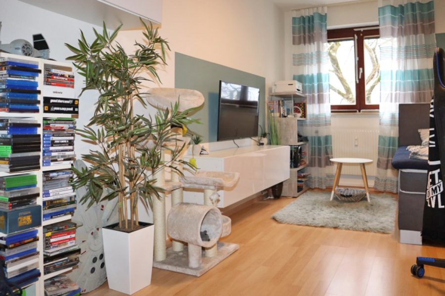 Neben dem Gästezimmer befindet sich das Wohnzimmer. Der Wohnbereich hat über 20 m² und bietet viel Platz für eine gemütliche Couchlandschaft und einen Esstisch. Von dem Wohnzimmer gelangen Sie zu dem französischen Balkon. Sie blicken von diesem aus in Richtung Osten.