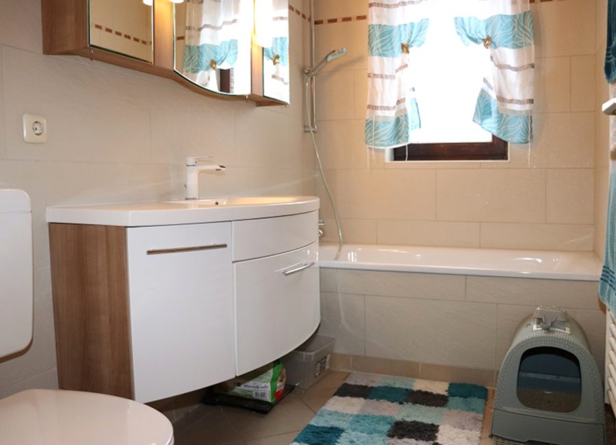Gleich rechts gelangen Sie in das Badezimmer, wo Sie den Feierabend bei Kerzenlicht in einer großen Badewanne gemütlich ausklingen lassen können. Das Bad verfügt über ein Fenster und wurde 2009 komplett saniert. Die hellen Bodenfliesen verleihen dem Raum eine gewisse Eleganz.