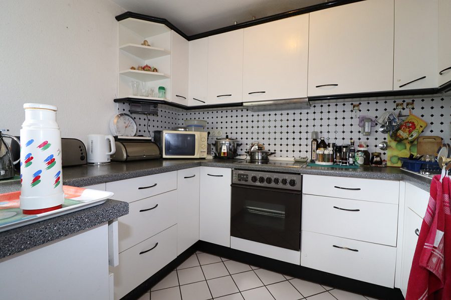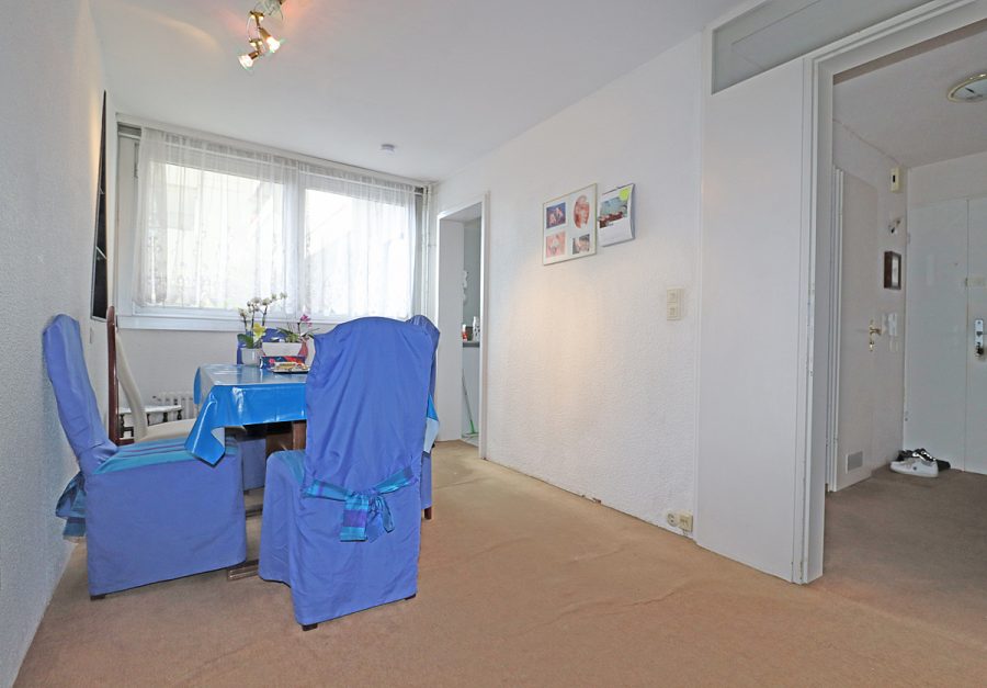 Geradeaus geht´s zum Essbereich, der aufgrund seiner Größe als 1/2 Zimmer hier definiert ist. Der separate Essbereich ist sehr praktisch, denn umso mehr Platz hat man dann im Wohnzimmer und in der Küche. Gegenüber befindet sich die große Einbauküche, die sehr gepflegt ist und zum gemeinsamen Kochen einlädt.