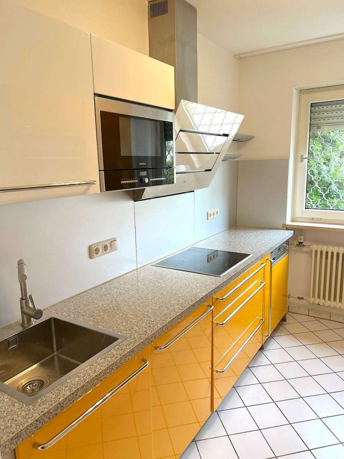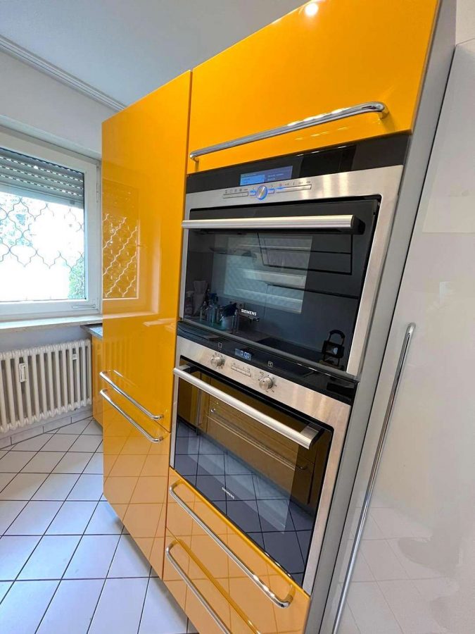 Die hochwertige Einbauküche mit modernen Markengeräten rundet die Ausstattung perfekt ab und macht Kochen zum Vergnügen. Die Farbe der Einbauküche entspricht dem Stil der Architektur der 70 Jahre.