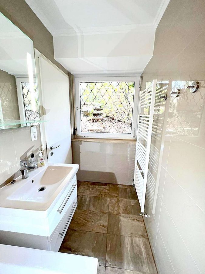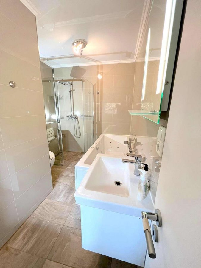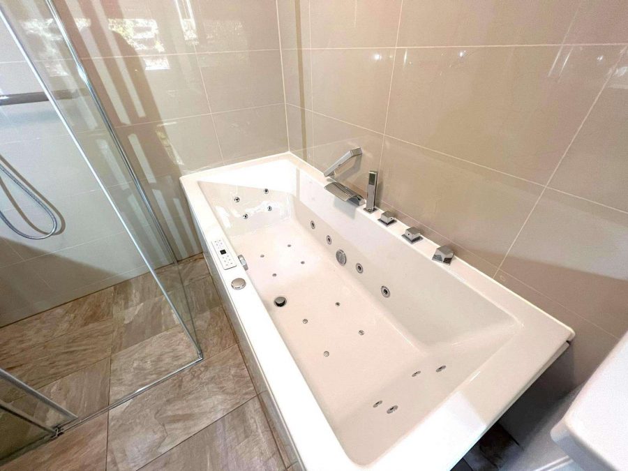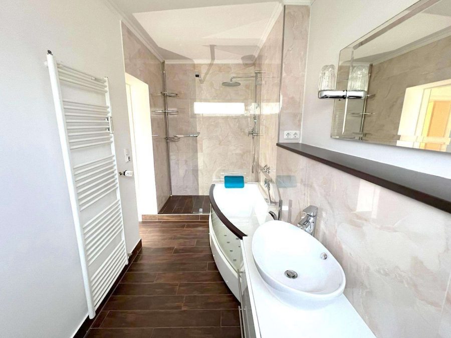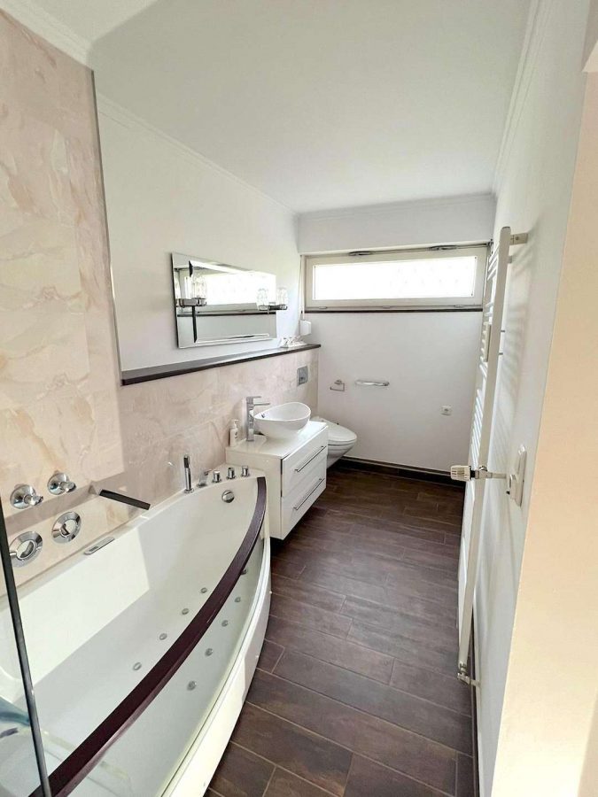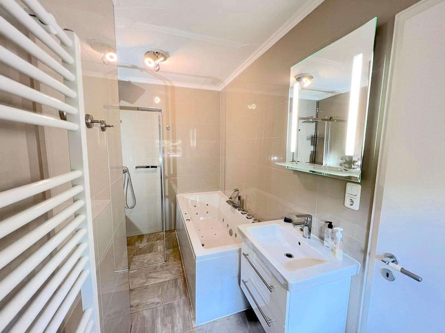 Besonderes Highlight ist das luxuriöse Badezimmer, das keine Wünsche offenlässt. Es ist ausgestattet mit einer eleganten Badewanne mit Whirlpool-Funktion, einer modernen Dusche, einem Handtuchheizkörper – eine private Wellness-Oase direkt in den eigenen vier Wänden.