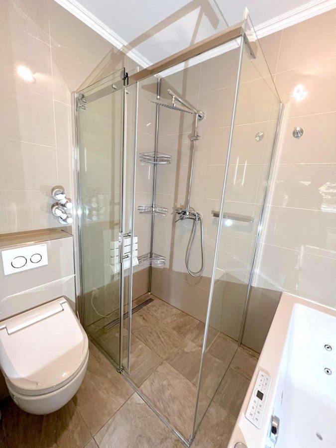Zusätzlich gibt es im Untergeschoss ein weiteres vollständiges Badezimmer mit Badewanne, Wellness-Dusche und WC – ebenso luxuriös gestaltet wie das Hauptbad im oberen Bereich.