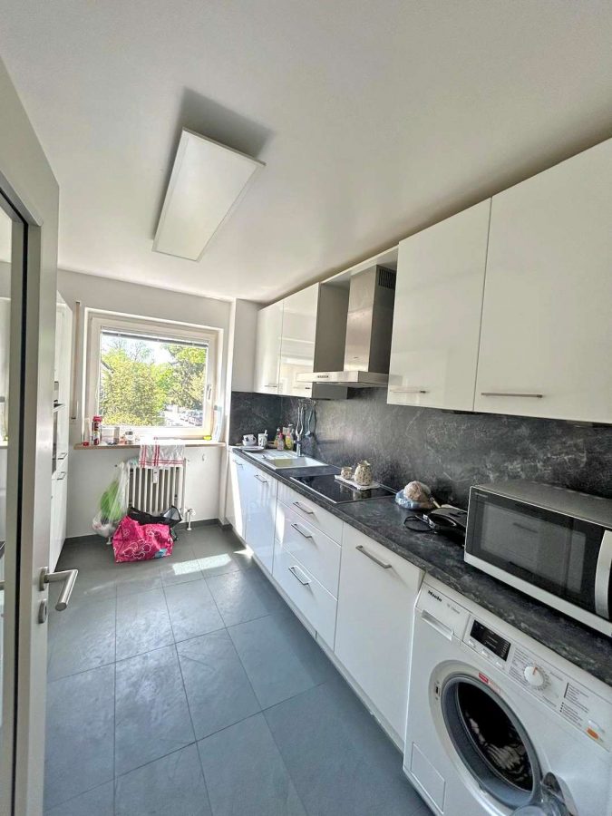 Die Küche ist mit einer hochwertigen Einbauküche ausgestattet und bietet ausreichend Platz zum Kochen und Genießen. Dank der ruhigen Ausrichtung der Wohnung genießen Sie hier sowohl Komfort als auch Privatsphäre.