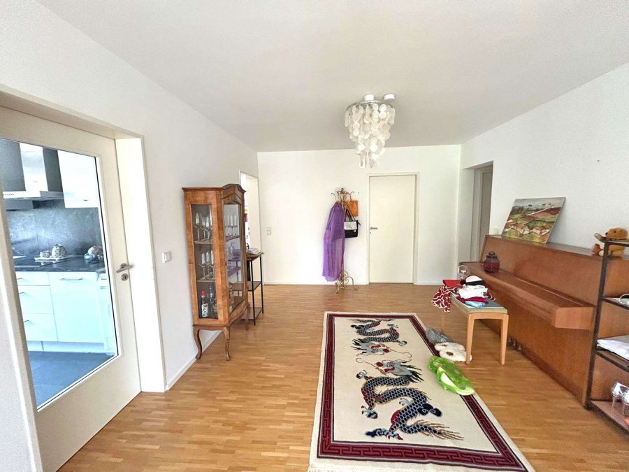 Der großzügige Wohnbereich mit direktem Zugang zum großen, ruhig gelegenen Balkon lädt zum Entspannen und Verweilen ein. Die offene Raumgestaltung schafft eine angenehme Wohnatmosphäre, während der Echtholzparkettboden in allen Wohnräumen für ein warmes und stilvolles Ambiente sorgt.