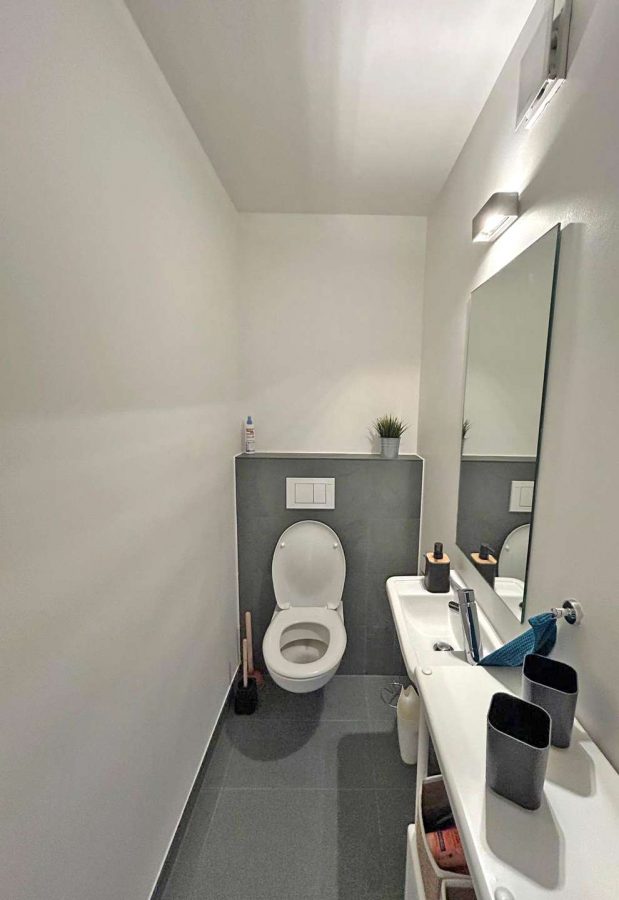 Die Wohnung verfügt über ein geräumiges Schlafzimmer sowie zwei gut geschnittene Kinderzimmer, die vielfältige Nutzungsmöglichkeiten bieten. Das modern geflieste Badezimmer ist mit einer Dusche, Badewanne und einem WC ausgestattet. Zusätzlich steht ein separates Gäste-WC zur Verfügung.