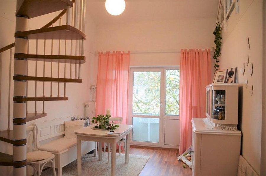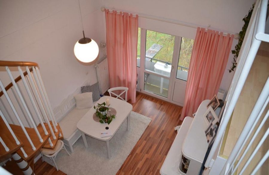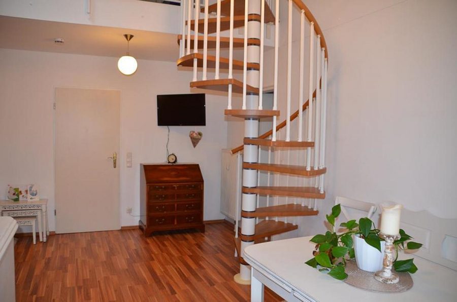 Ein weiteres Highlight ist die Wendeltreppe ins obere Geschoss. Von dort haben Sie einen fantastischen Blick über den Wohnbereich. Des Weiteren bietet dieser Bereich weitere Stellflächen an. Die Galerie rundet die offene Bauweise der Wohnung ab.