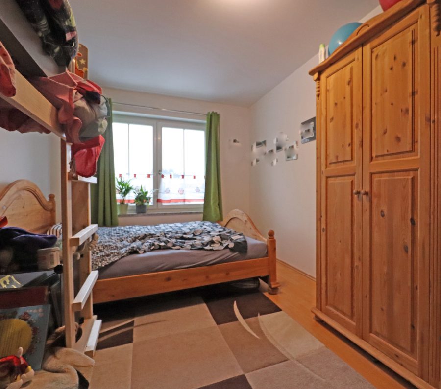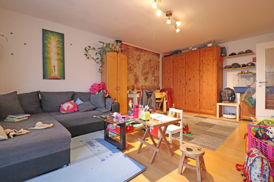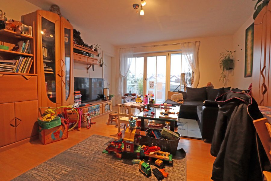 Auf der rechten Seite der Wohnung befindet sich mit dem großzügig geschnittenen Wohnzimmer der Mittelpunkt der Wohnung. Von diesem Raum aus kann man den nach Süden ausgerichteten überdachten Balkon betreten. Dieser ist ruhig, mit Blick ins Grüne, gelegen.