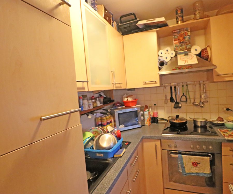 Vom Wohnzimmer abgetrennt, befindet sich die Küche. Die Einbauküche kann preiswert vom Vormieter abgelöst werden.