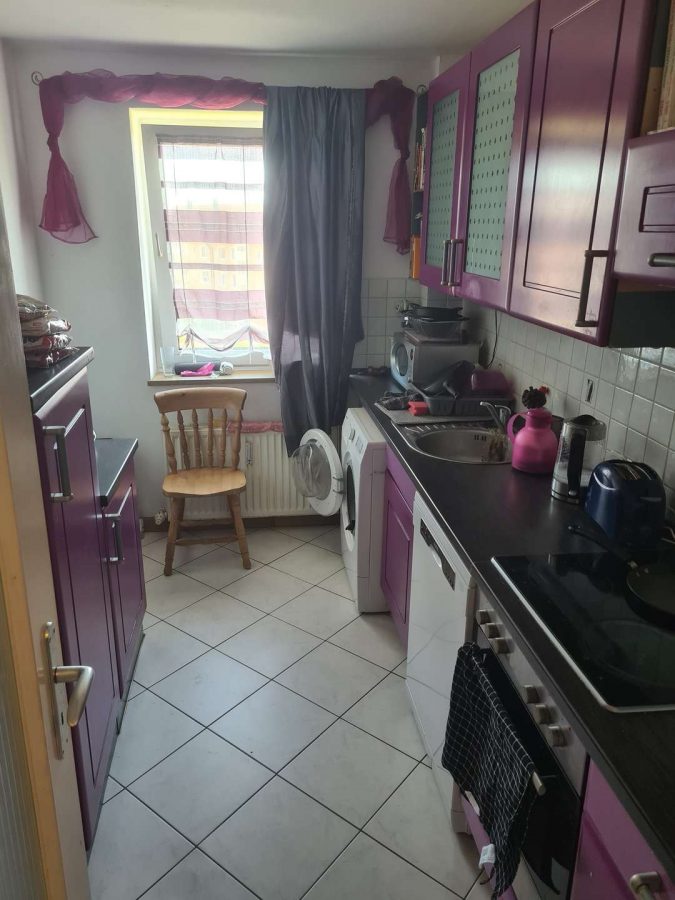 Als erstes kommt auf der rechten Seite eine von den Wohnräumen abgetrennte Küche. Die Einbauküche muss der Mieter stellen bzw. kann vom Vormieter günstig abgelöst werden.