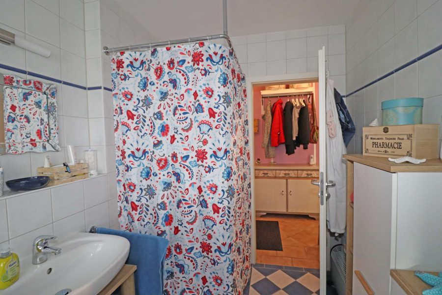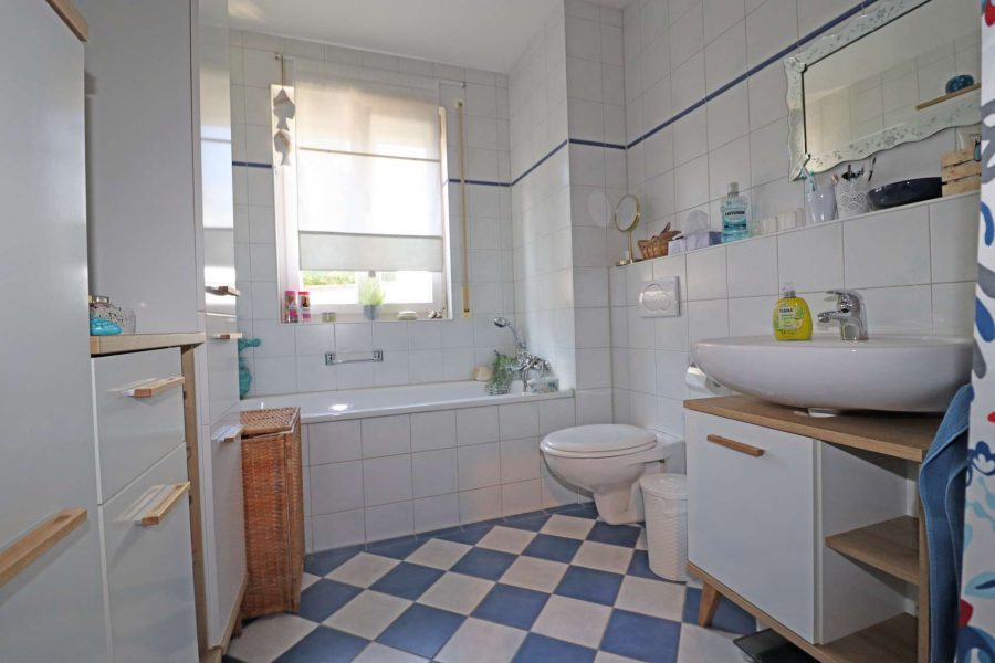 Über die Diele gelangen Sie weiter zum Badezimmer, in dem Sie zusätzlich zur Dusche und WC noch eine Badewanne nutzen können. Das Bad verfügt über ein Fenster, wodurch es sehr freundlich hell ist und man gut lüften kann.
