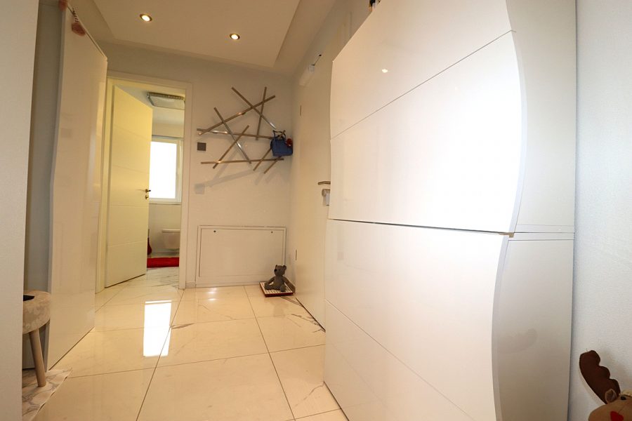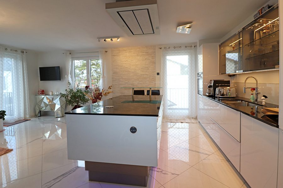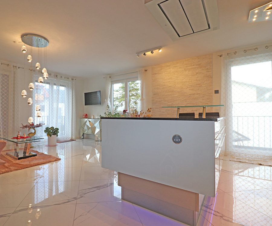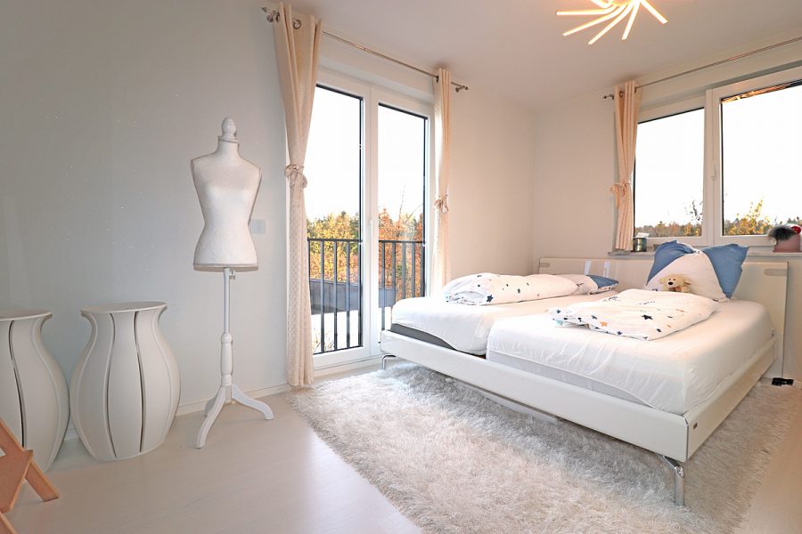 In allen Wohnräumen sind weiß gefärbtes Echtholzparkett und italienische Fliesen verlegt worden. Es ist überall Smart-Home-Technik verbaut. Das heißt man kann die Rollläden, die Fußbodenheizung, Beleuchtung etc. bequem mit dem Handy bedienen.