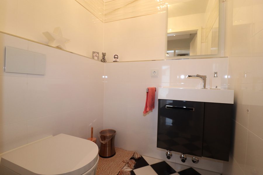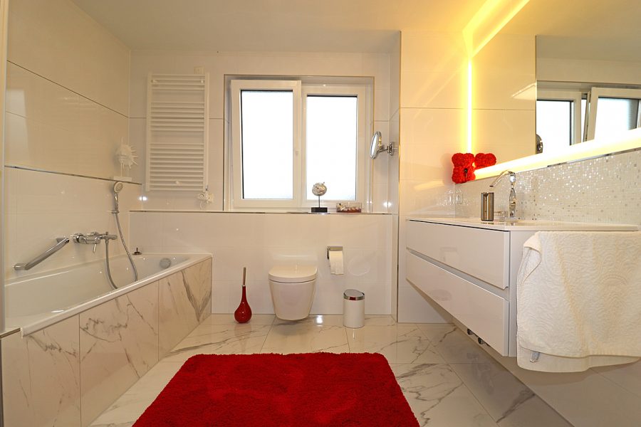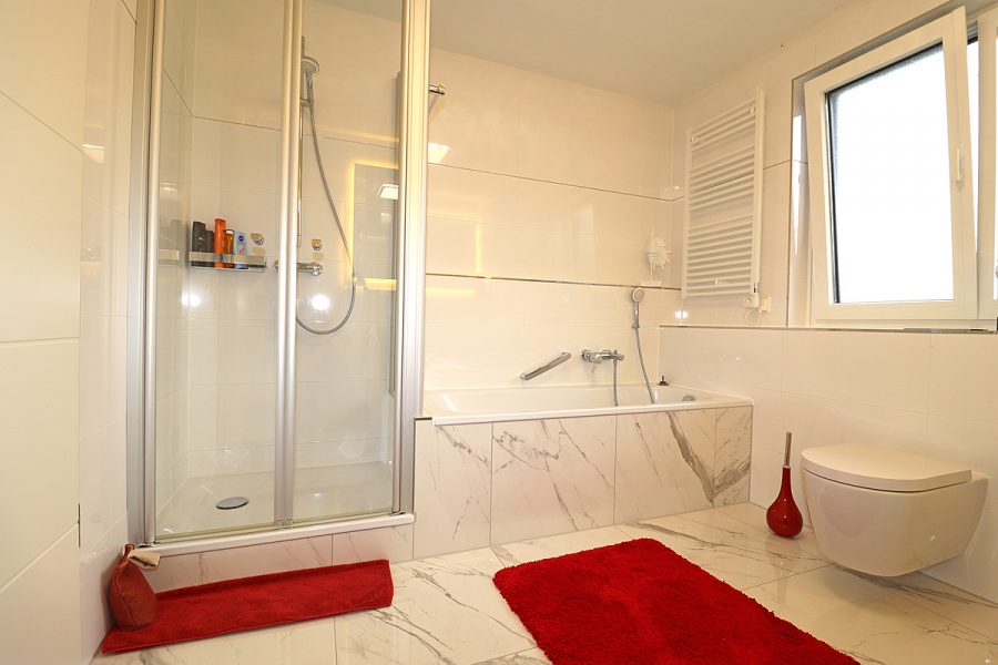 Neben dem Schlafzimmer befindet sich das moderne Badezimmer, welches mit einer Badewanne und einer Dusche glänzen kann. Hier kann man den Tag mit einer Wellnessdusche beginnen und mit einem erholsamen Bad bei Kerzenschein wieder ausklingen lassen.