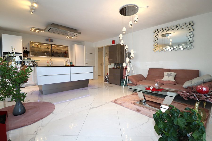 Der Boden im Wohnzimmer ist mit italienischen Fliesen ausgestattet. Durch die Fußbodenheizung wird eine wohltuende Wärme in jedem Raum erreicht.
