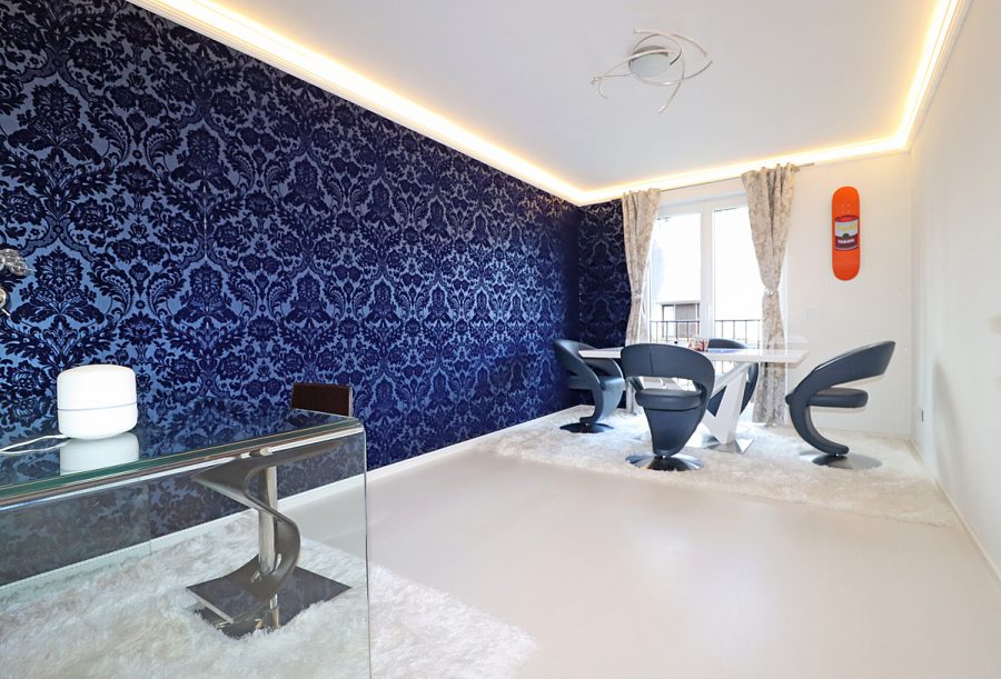 Weiterhin gelangt man über den Flur zum Gäste- bzw. Arbeitszimmer. Der Boden besteht aus weiß gestrichenen Echtholzparkett. An der linken Wand ist ein Vließ mit Design vom Harald Glööckler angebracht.