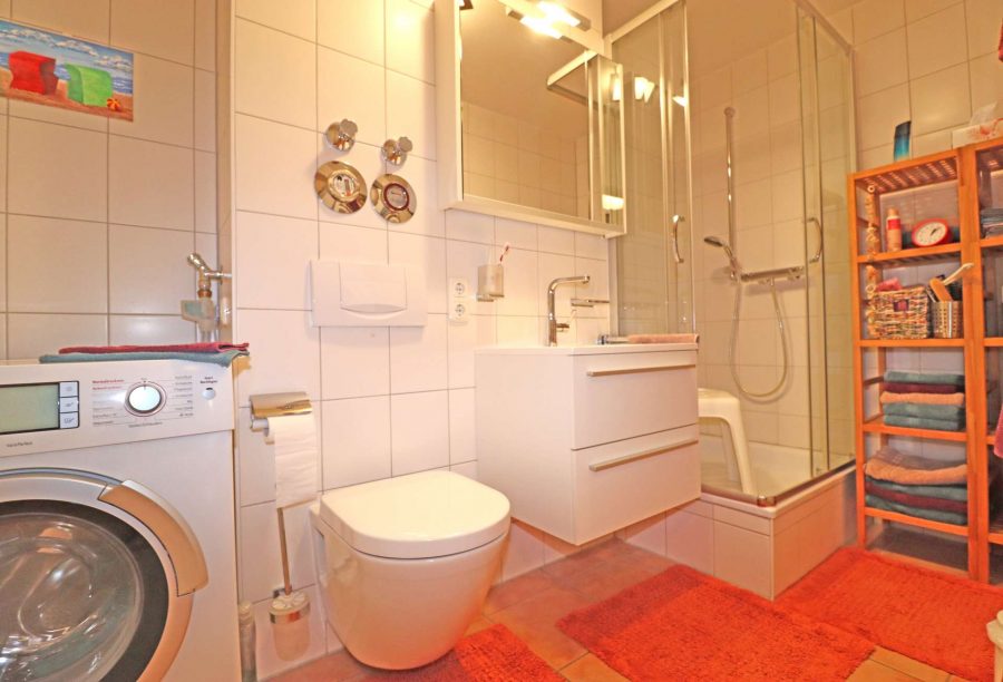 Das Badezimmer ist mit einer Dusche ausgestattet und verfügt zudem über einen praktischen Waschmaschinenanschluss. Rollläden sind in fast allen Wohnräumen vorhanden – lediglich im Wintergarten nicht – und zusätzlich sind in den meisten Räumen auch Plissees angebracht, die für angenehmen Sicht- und Sonnenschutz sorgen.
