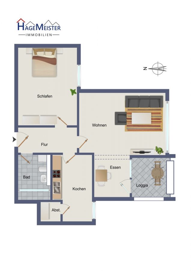 Neben dem Schlafzimmer befindet sich mit dem Wohnzimmer das Highlight der Wohnung. Der Wohnbereich bietet viel Platz für eine gemütliche Couchlandschaft und einen Esstisch. Von dem Essbereich gelangen Sie zu der nach Süden ausgerichteten Loggia.