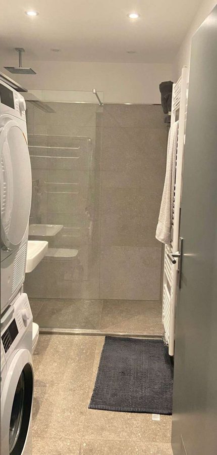 Rechts davon gelangen Sie in das letztes Jahr TOP sanierte Badezimmer, welches mit einer Wellnessdusche ausgestattet ist. Waschmaschine und Trockner sind auch hier gelegen.