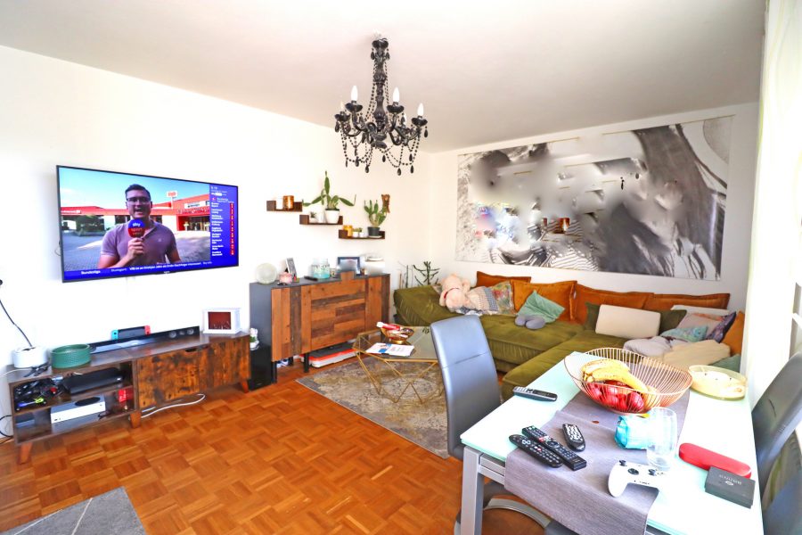 Das Herz der Wohnung ist das geräumige Wohnzimmer mit direktem Zugang zur Süd-Loggia. Hier kann man den Feierabend gut ausklingen lassen.