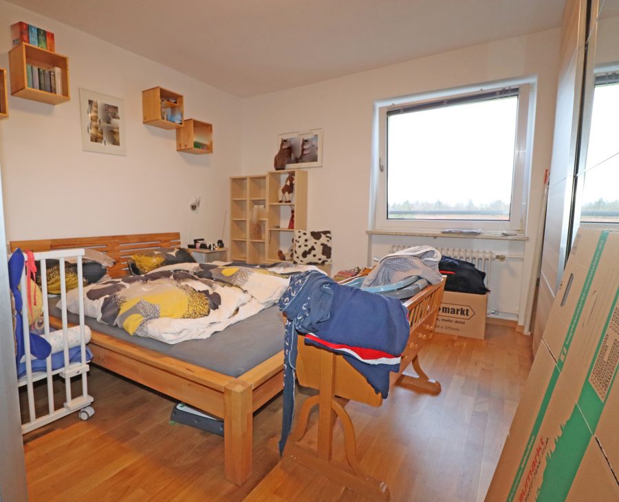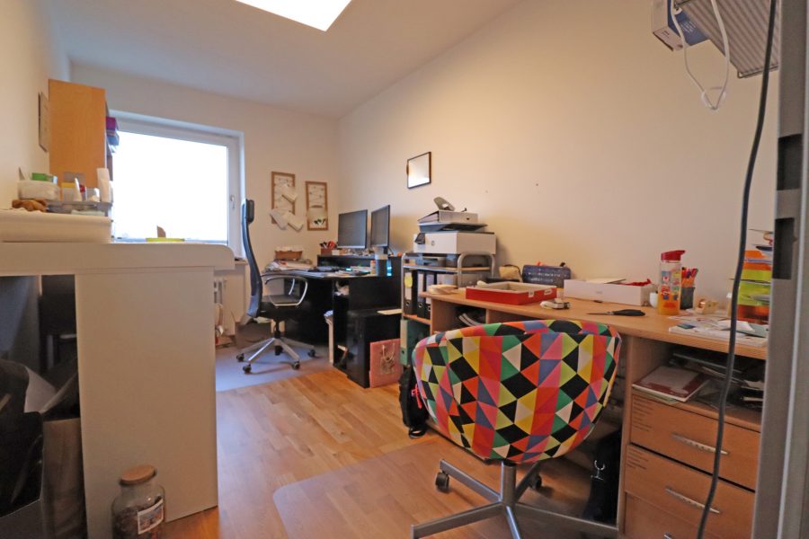 Neben dem Wohnzimmer befindet sich das Schlafzimmer, welches genug Platz für einen großen Schrank und ein XXL-Bett bietet. Als nächstes kommt das Kinder-/Arbeitszimmer.