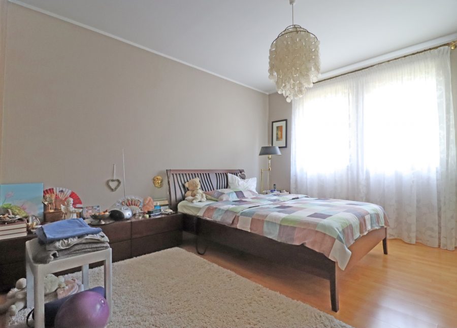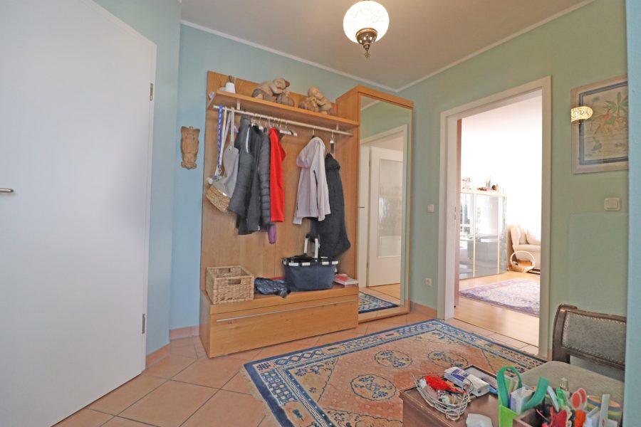 Im Eingangsbereich befindet sich eine geräumige Garderobe. Der Flur führt gleich rechts zum Schlafzimmer. Hier haben Sie genügend Platz für ein extra großes Bett, einen großen Kleiderschrank und Kommoden.
