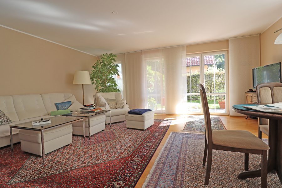 Über den Flur geht es weiter zum Wohn- und Essbereich. Von hier aus haben Sie auch Zugang zur traumhaften Süd-Terrasse mit Garten. Der Garten erstreckt sich über die Süd- und Westseite des Gebäudes.